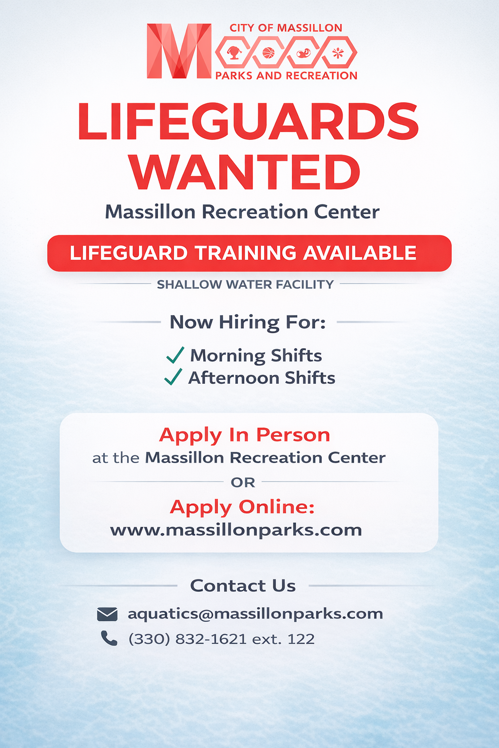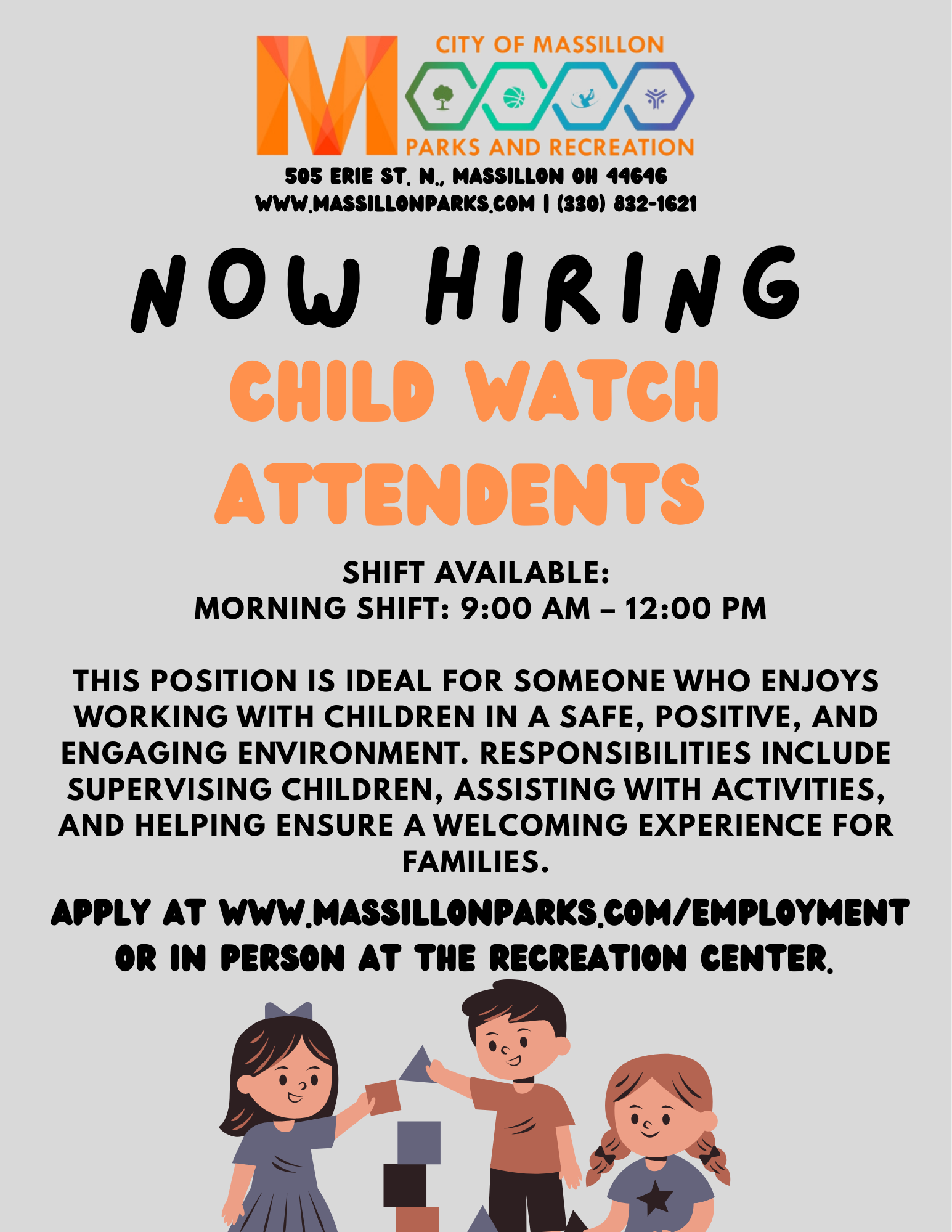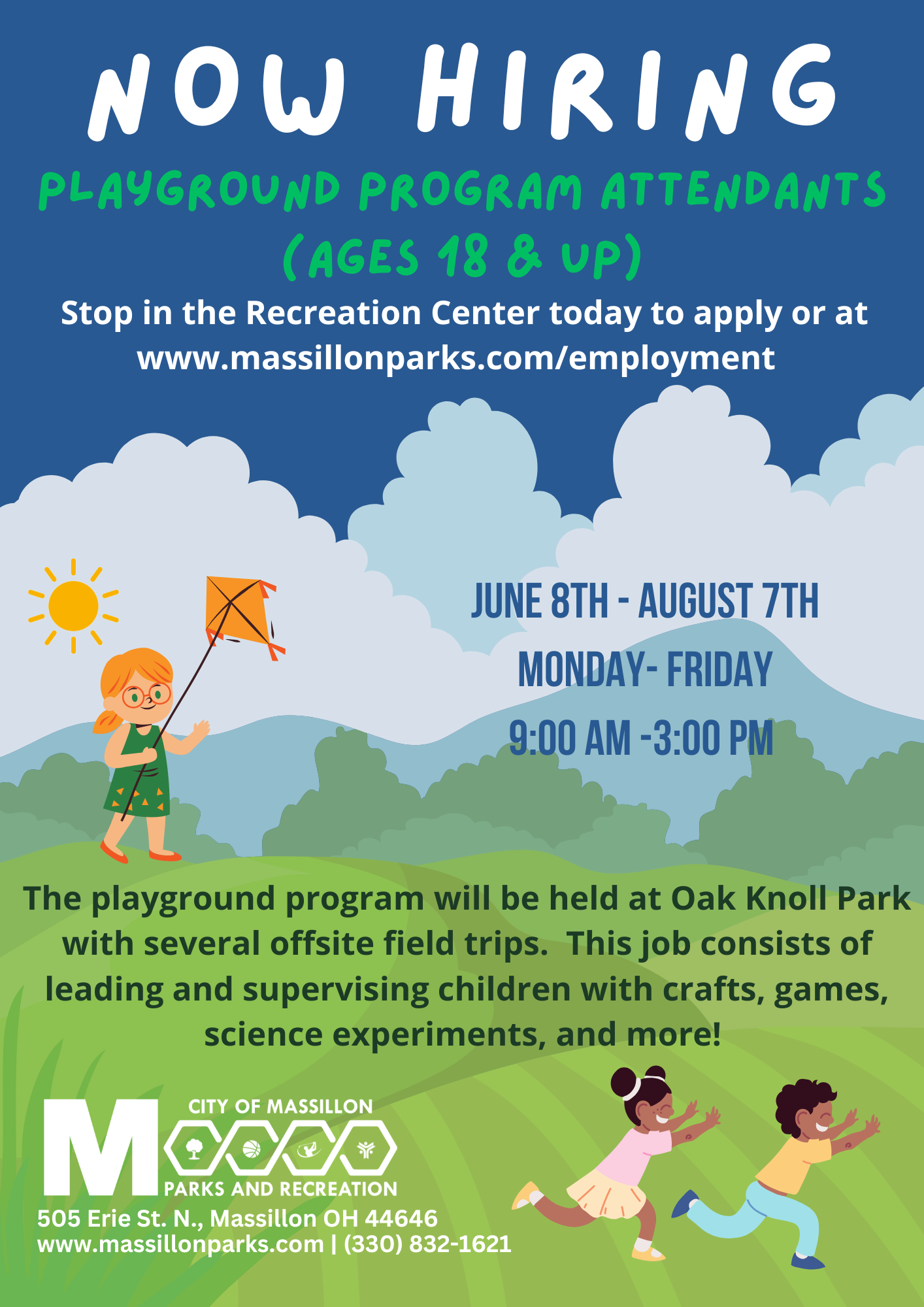 The City of Massillon Parks and Recreation is dedicated to creating positive experiences by providing quality parks, facilities, services, and programs. Our parks, green ways, fairways, and recreational facilities represent safe and positive community developments, which support first rate leisure activities.